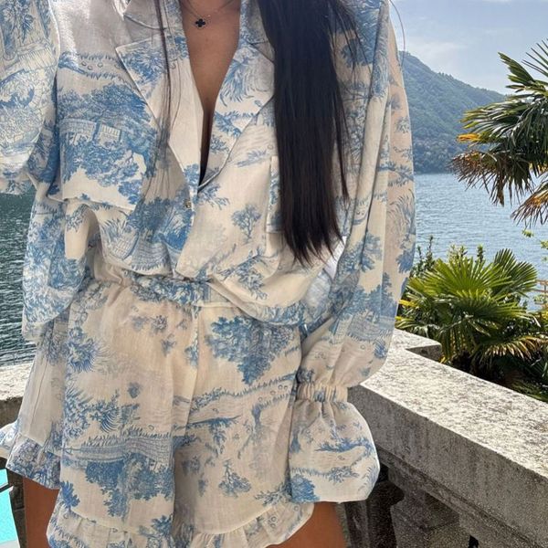Dropshipping Summer Casual Suits Floral Flared Long Sleeve Shirt Top Outfits Clothing Elegant 2 Piece Blouse Ruffle Shorts Set$17.34