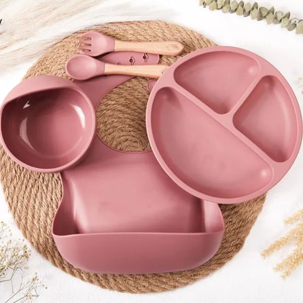 OEM Silicone Baby Feeding Tableware Set Includes Cup Bowl Suction for Kids' Dining Dish Bibs Toddler Spoon Divided Plate for$0.87