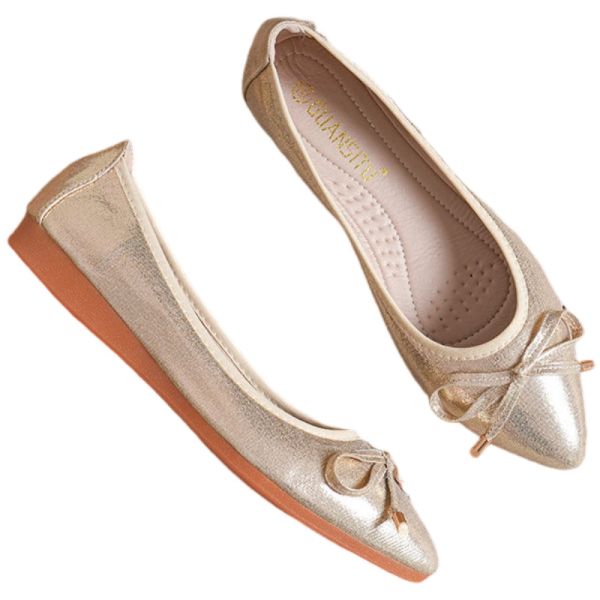 Luxury Gold Ripple Leather Women's Round Toe Ballet Flats Comfortable Bow Dressy Flats Shoes for Women Girl$16.99