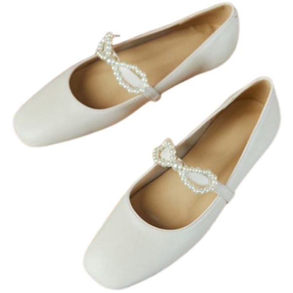 Luxury Pearl Mary Jane Shoes Ladies Pumps Leather Retro Square Toe Soft Sole Flat Ballet Shoes for Women$15.5
