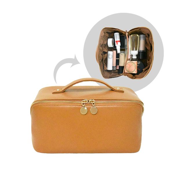Factory Custom High Quality PU Leather Waterproof Open Flat Makeup Bag Large Capacity Travel Toiletry Organizer with Zipper$4.07