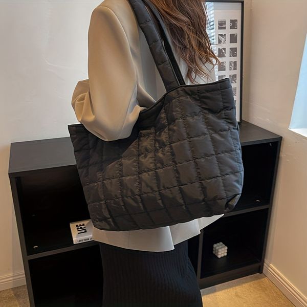 Royal Fair Customized Oversized Solid Puffy Nylon Quilted Tote Cotton Bag Autumn Stylish Spacious Lattice Embroidery Tote Bag$5.1