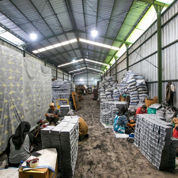 workers at coconut charcoal briquettes factory