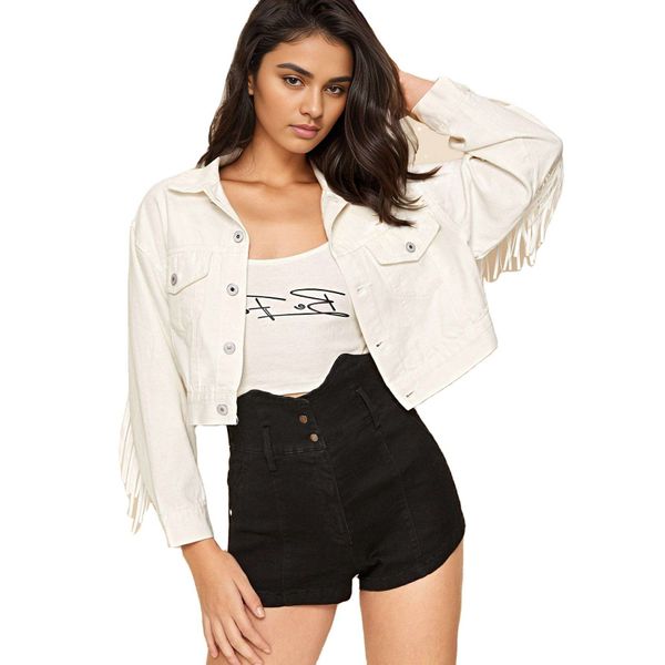 4087 Manufacturer Turn Down Neck Back Shoulder Tassels Women Denim Jackets Fashion Oversized White Fringes Women Denim Jackets$10.32