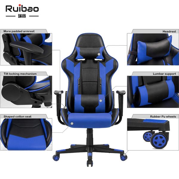 PU Leather Gamer Silla Chair Adjustable Height Swivel Chair Revolving for Bedroom Cheap Blue Synthetic Leather Gaming Chair$42