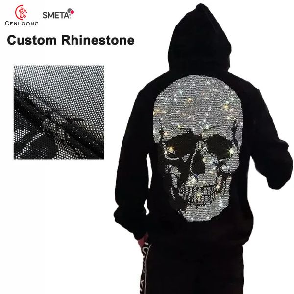 Custom logo Letter Skeleton Full Face Zip up Skulls Drawstring String Rhinestone Hoodie Streetwear for Men$8
