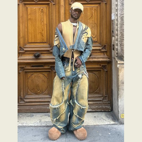 DiZNEW 2025 Men's Jeans Manufacturer Heavy Industry Snowflake Workwear Jeans, Men's Spring Fringed Patchwork Wide-leg Jeans$8.95