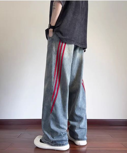Color Contrast Striped Jeans Men's Loose Straight Leg American High Street Wash Pants$9.5