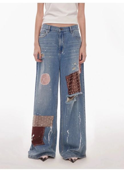 Leopard Print Patchwork Women's denim jeans Custom Washed blue straight Jeans for women$8.8
