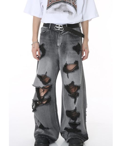 Niche Personality Loose Do Dirty Heavy Stitching Holes Deconstructed Straight Leg Jeans$9.5