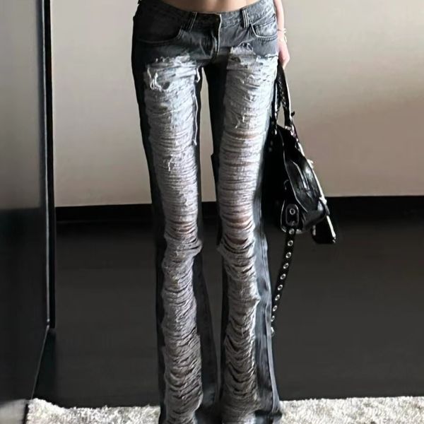 Women Distressed Ripped Jeans Y2K Streetwear Sexy Ladies Cutout Hole Tassel Hollow Out Wide Leg Straight Denim Jeans Pants$12.59