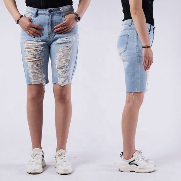 Quality Manufacturers 100% Cotton Ripped Summer Bermuda Women Shorts in Jean$7.8