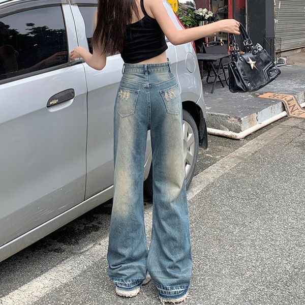 American New Retro Blue High-waisted Baggy Wide-leg Pants Draping All Match Straight Leg Jeans Female$8.4