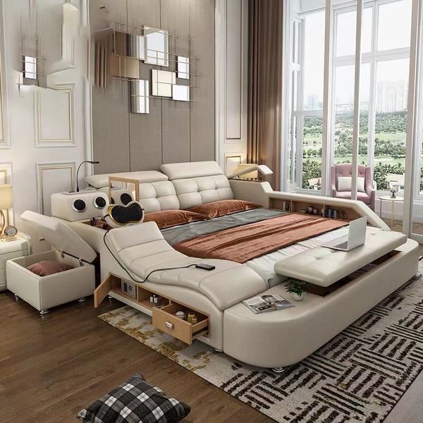 Modern Wooden Frame Multifunctional Double Bed Bedroom Furniture Set Luxury Leather King Size Smart Bed$500