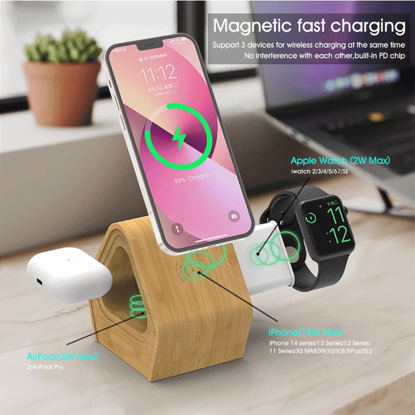 3 in 1 15W Magnetic Bamboo Wireless Charger Station Mobile Phone Charger for iphone & AirPods & Apple-Watch$11.99