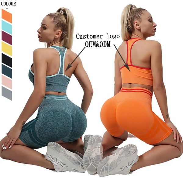 Custom Solid Gym 2 Piece Yoga Short Sets Women Fitness Workout Outfits Tights Sports Bra Shorts Set$7.58