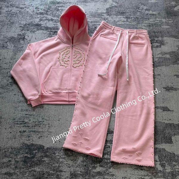 Streetwear Custom Embroidery Rhinestone Logo Pullover Distressed Acid Wash Hoodie Distressed Flared Sweatpants Mens Hoodie Set$20.84