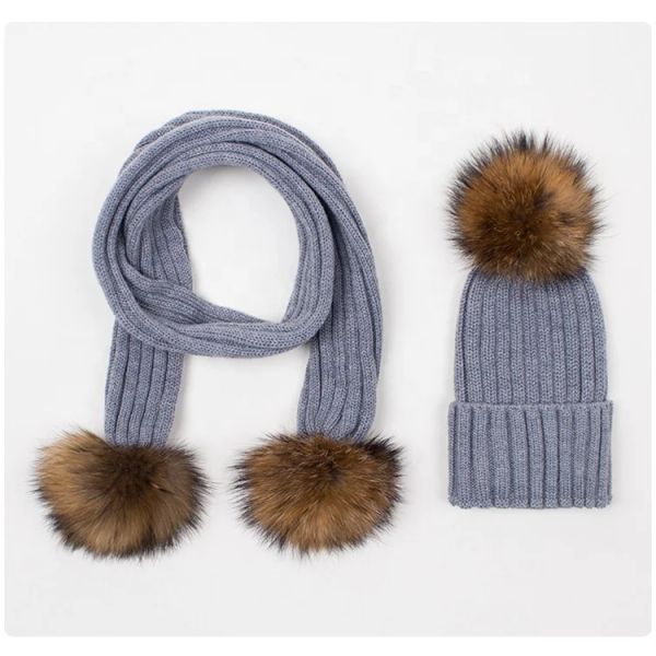 Knitwear Manufacturer Winter Fur Pom Pom Wool Blend Sweater Custom Knitted Adults Kids Scarf and Hat Sets$15.5
