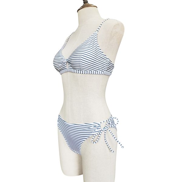Blue and White Horizontal Stripe Bikini Bottom with Side Ties Ruffled Top Design 2 Pcs Eco-friendly Beachwear Bikini for Women$5.6