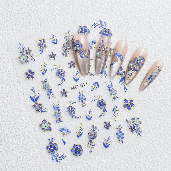 Embossed/Flat Effect Blue Flower Nail Stickers Adhesives DIY Press on Nail Decal Beauty Products Manicure Decoration$0.2
