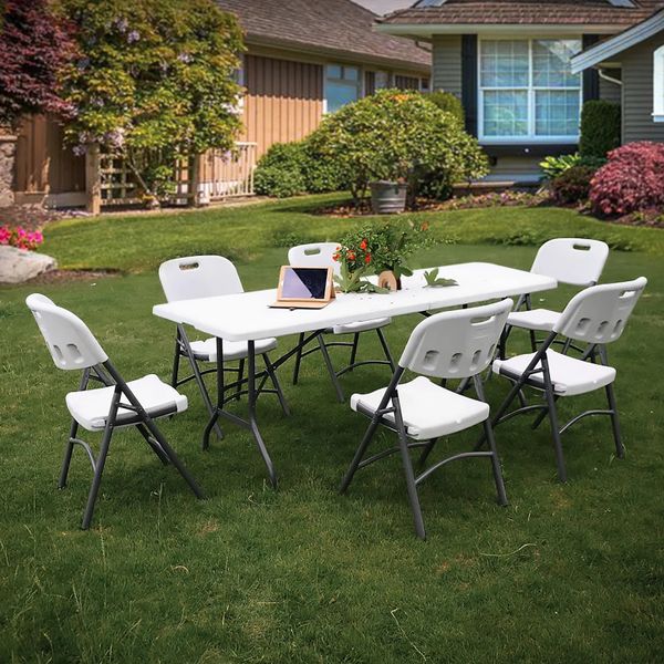 Modern HDPE Plastic Folding Tables Chairs Portable Steel Frame Outdoor Furniture for School Farmhouse Catering Dining Parties$8
