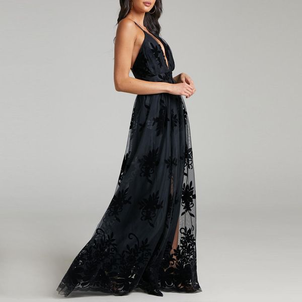 New Deep V-neck Lace Net Yarn Elegant Dress Backless Side Split Embroidered Sexy Wedding$15.99