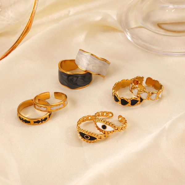 YWXS 18k Gold Plated Stainless Steel Fashion Jewelry Black White Oil Dripping Niche Design Sense Eyes Heart Ring for Women$0.75