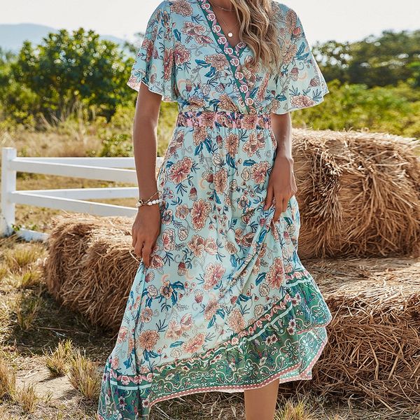 Custom Oem Summer Women V Neck Belted Loose Dress Floral Lady Short Sleeve Casual Women's European Asian Style Dresses$11.3