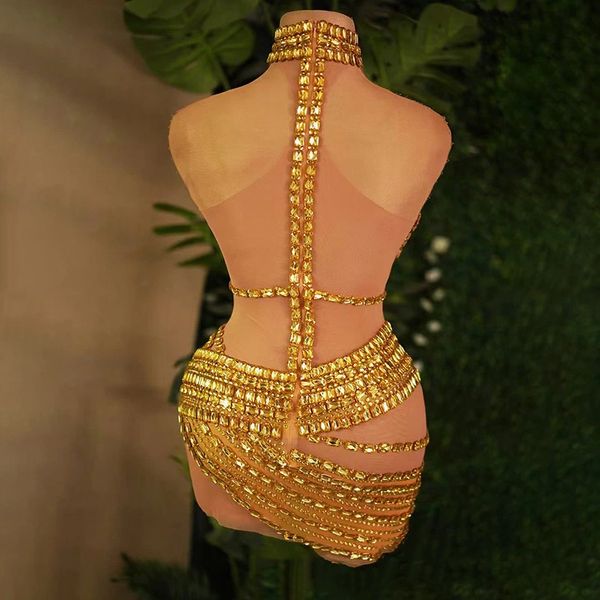Luxury Gold Rhinestone Stage Outfit Women Sexy Halter Bodycon Mini Dress Sparkly Performance Costume Dance Clubwear Party Wear$47.9