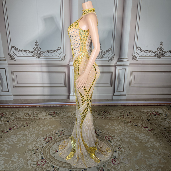 Luxury Golden Mirror Sequins Evening Gown Sexy Mermaid Maxi Dress Women Sparkling Beaded Formal Party Stage Performance Wear$98.9
