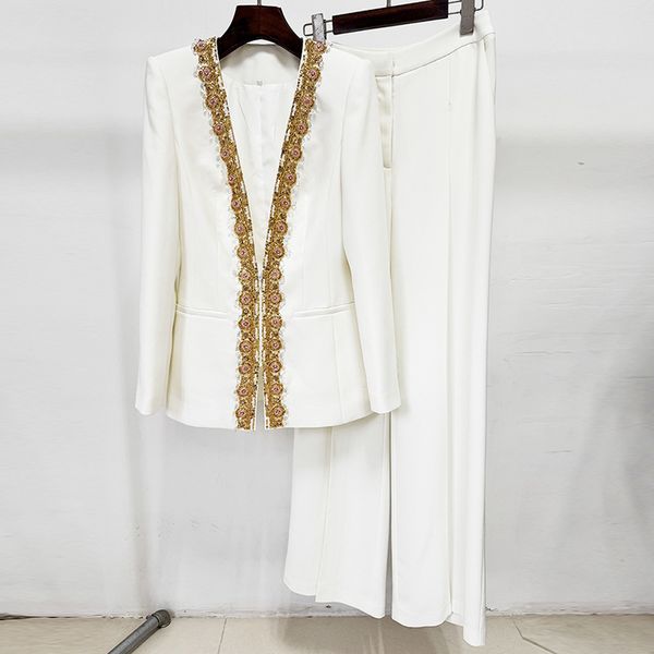Elegant Formal Evening Wear White Long Sleeve Beaded Gold Trim Blazer Wide Leg Pant Two Piece Set Suits for Women$55.9