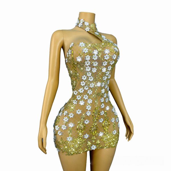 Luxury Sexy Floral Mini Club Dress Women Crystal Beaded Mesh Bodycon Party Dresses Nightclub Cocktail Performance Wear$55.5