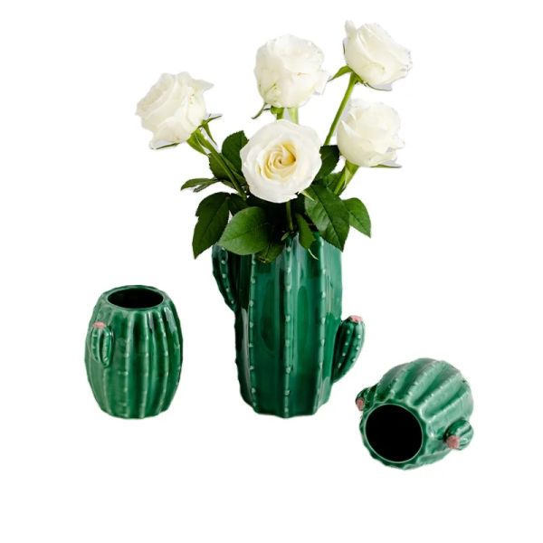 Ceramic Antique Hand Painted Vase Green Cactus Vase Ceramic Beige Vases for Home Decor$2.5