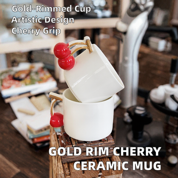 Creative Modern Hand-Painted Gold Rim Red Cherry White Ceramic Coffee Mug Office Home Gift Cup for Business Occasions$2.7