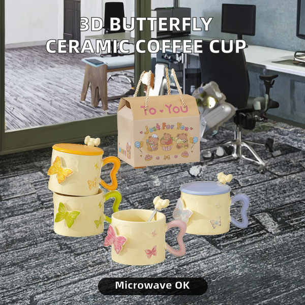 Novelty 3D Butterfly Embossed Ceramic Mug Home Office Breakfast Tea Cup with Spoon for Coffee Milk Creative Gift for Giveaways$2.6