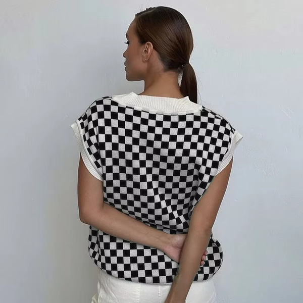 2025 Custom Logo Aesthetic Checkerboard Plain V Neck Sleeveless Sweater Vest Y2K Tank Top Knitted Women Sweater$11.59