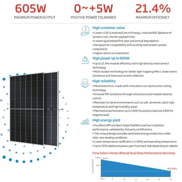 Best Price Trina Bifacial Dual Glass Solar Panel 605W PV Module Monocrystalline Solar Panel$0.12