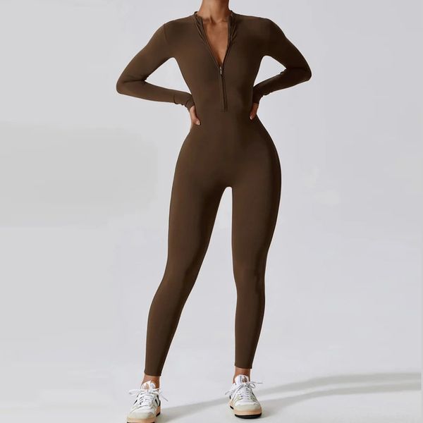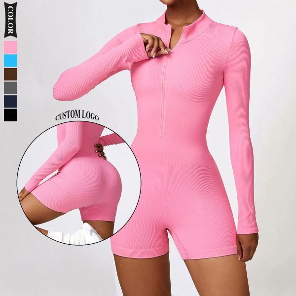 Custom Half Zipper Long Sleeves Jumpsuits Women Fitness Sportswear Workout Gym Bodysuits Playsuits With Shorts$10.99
