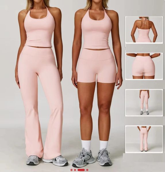 HUACHEN Hot Sale High Quality Halter Neck With Chest Pad Sports Bra Breathable Fitness Shorts Women Yoga Wear 2 Piece Set$15.8
