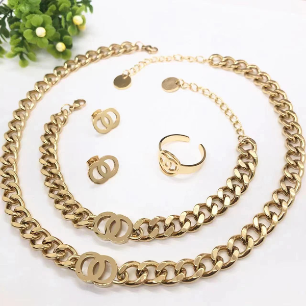 Designer Luxury Brand Women's 18k Gold-plated Stainless Steel Jewelry Set Earrings Necklace Ring Bracelet Wedding Gift.$8.27