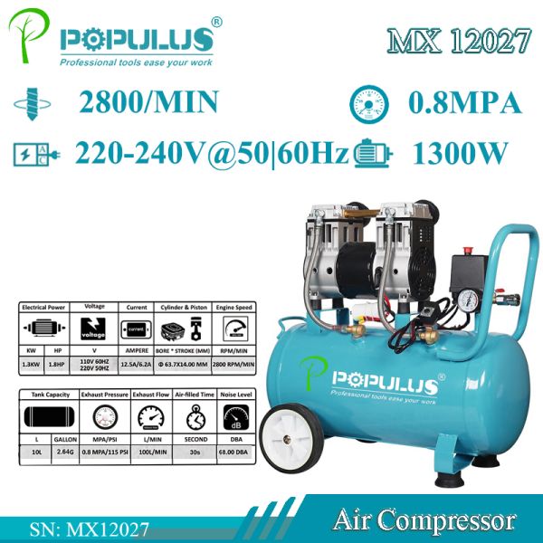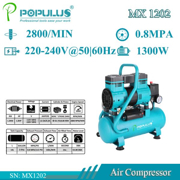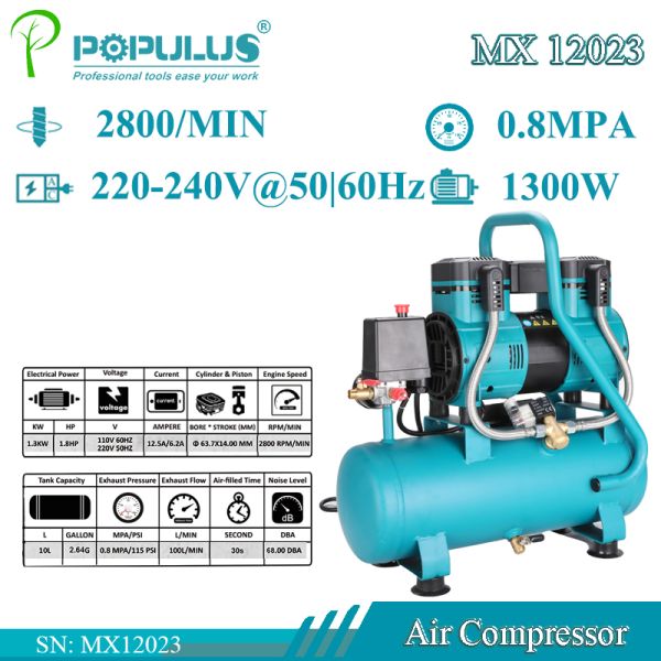 Populus Industrial Quality 8bar 1300W Oil Free Portable Piston Air Compressor Reciprocating Compressor for Factory & Industial Workshop for Argentina Market$0.99