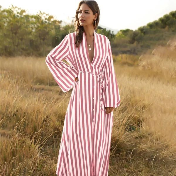 2021 Wholesale Pink Color Stripes Orange Color Stripes Black Stripes V Neck Girls Women Casual Dress Holiday Women Clothing$9.5