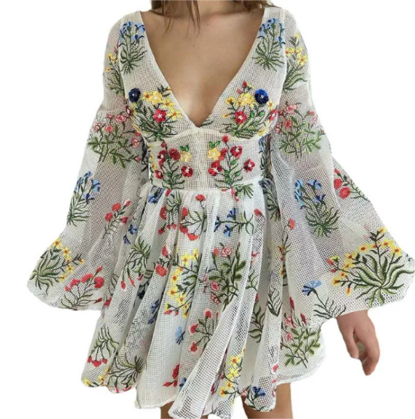 Summer New Mesh Embroidery Design Sense Lantern Sleeve Birthday Party Dress Dresses for Women$14