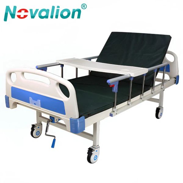 Wholesale Price Hospital Furniture Manufacturer Medical ABS Manual One Single Crank Hospital Bed with Mattress Siderail Dining Table Infusion Rod Wheels$30