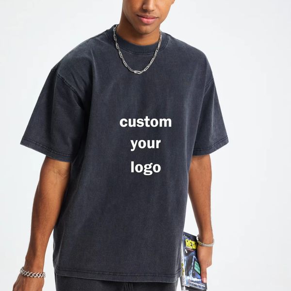 Custom Logo 230GSM Heavyweight Cotton Vintage Washed T-Shirt Wax Printing Snow Wash Process Retro Oversized Streetwear$3.8