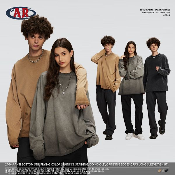 100% Cotton Oversized Drop Shoulder 275 g 3 Colors Vintage Wash Gradient Effect Edge Grinding Long-Sleeve T Shirt$9