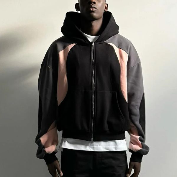 High Quality Custom Colorblock Patchwork French Terry 100% Cotton Cropped Zipper Boxy Hoodie Jacket for Men$11.5