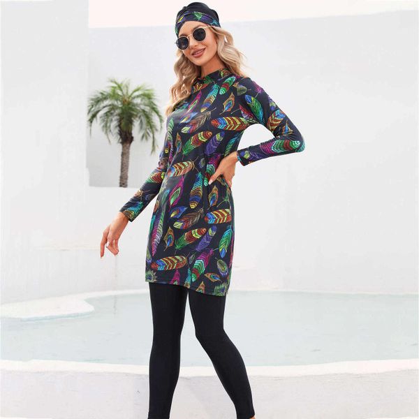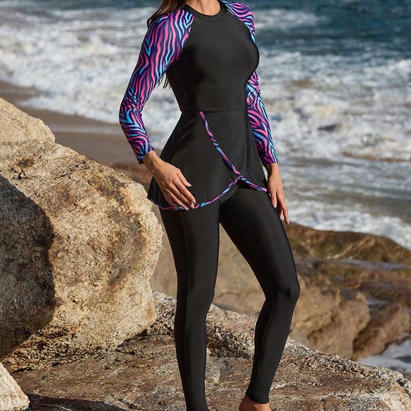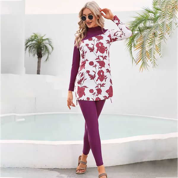 2025 Borkini Modest Swimwear New Muslim Swimsuit Printed Women's Long Sleeve Pants Swimsuit$11.25
