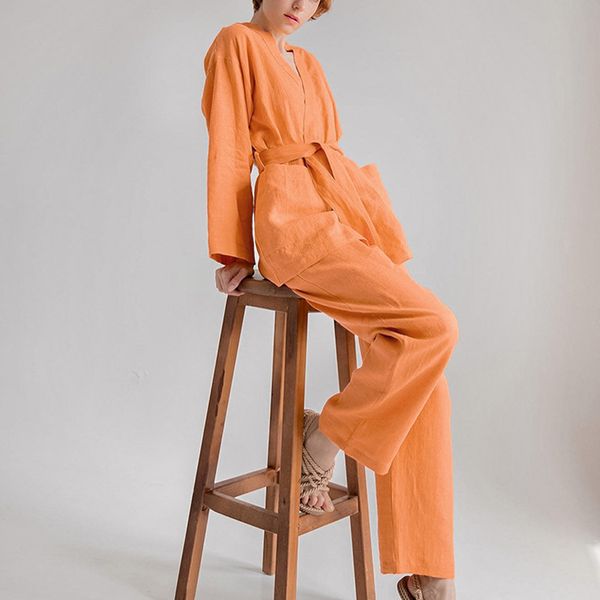 Women Linen Loungewear 2Piece Pants Set Wrap Top Nightgown Belt Robes Wide Leg Pants Kimono Pajamas$9.9