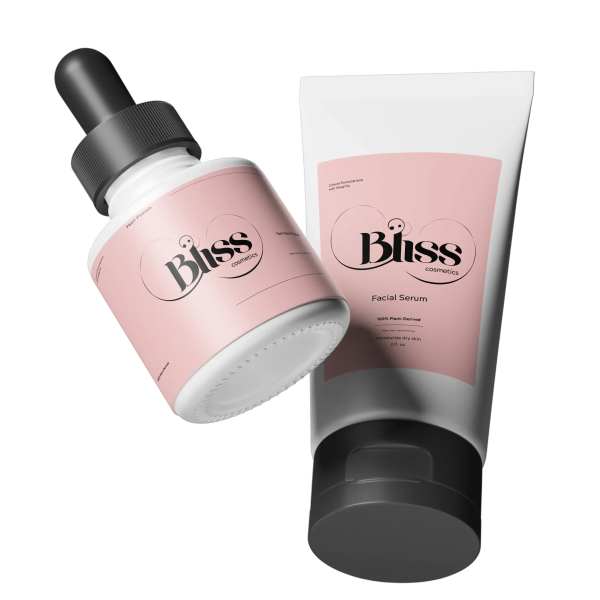 Bliss cosmetics packaging featuring a facial serum bottle and tube with pink labels, showcasing modern design and branding for personal care products.